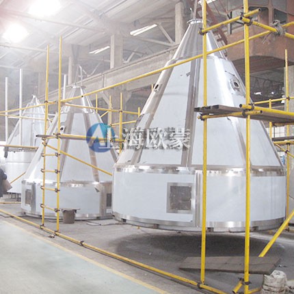 在噴霧干燥系統(tǒng)中,部分干粉在干燥室內(nèi)自由沉降至底部經(jīng)鎖氣閥分出;少部分細(xì)分隨尾氣攜出。從尾氣中分離出的乳粉形成回收系統(tǒng)。常用的**級(jí)分離器是旋風(fēng)分離器。