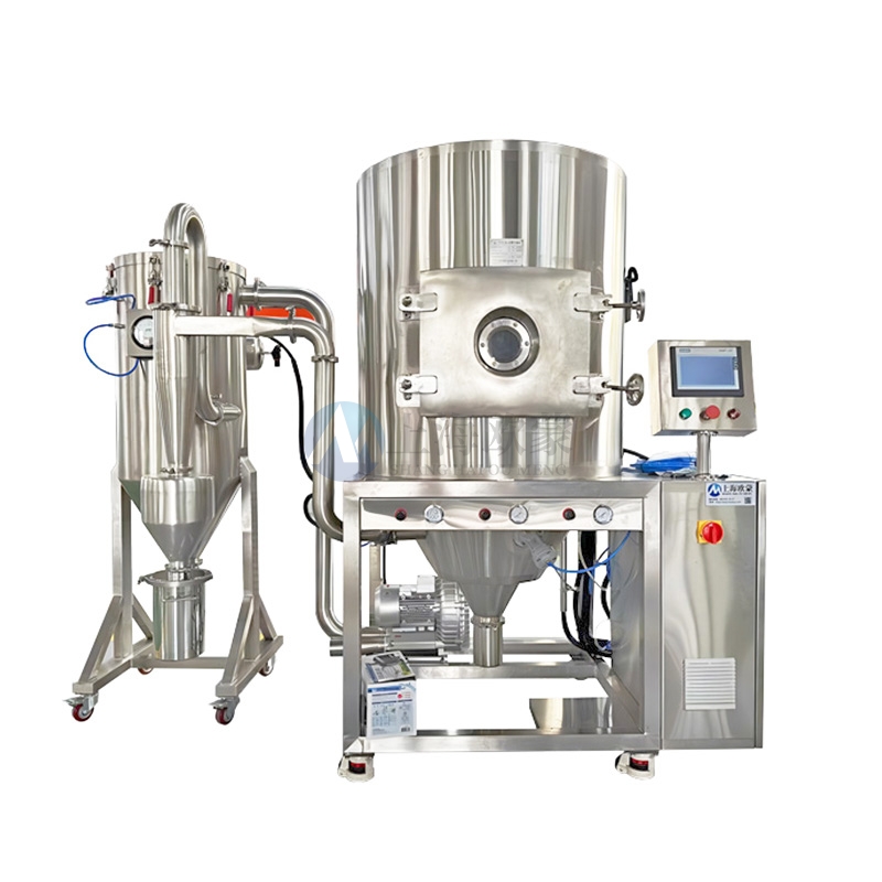 高速離心噴霧干燥機(jī) | 高效噴霧干燥設(shè)備 | 工業(yè)級(jí)快速干燥解決方案:干燥機(jī)為開(kāi)式循環(huán),并流式,離心式霧化。干燥介質(zhì)空氣經(jīng)過(guò)初、中效空氣過(guò)濾器過(guò)濾后根據(jù)操作指令由鼓風(fēng)機(jī)吸取再經(jīng)加熱器加熱通過(guò)高效過(guò)濾器的熱風(fēng)分配器進(jìn)入噴霧干燥主塔。液體物料根據(jù)操作指令經(jīng)過(guò)蠕動(dòng)泵,進(jìn)入高速旋轉(zhuǎn)的離心噴頭,在離心力作用下被分散成小霧滴。在噴霧干燥主塔內(nèi),小霧滴與熱風(fēng)在充分接觸,沿其特定路徑進(jìn)行熱交換后被干燥成為產(chǎn)品,然后通過(guò)旋風(fēng)分離器實(shí)現(xiàn)分離,固體物料被收集,氣體介質(zhì)再經(jīng)過(guò)過(guò)濾后被排出。整套噴霧系統(tǒng)易清潔、無(wú)死角,符合GMP要求。